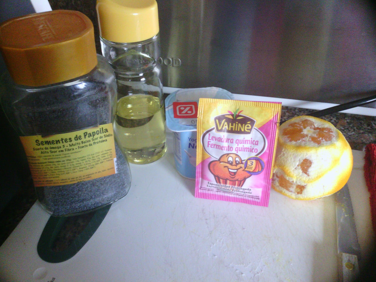 Iogurte, laranja e sementes de papoila!!Promete esse bolinho :)Um beijinho.