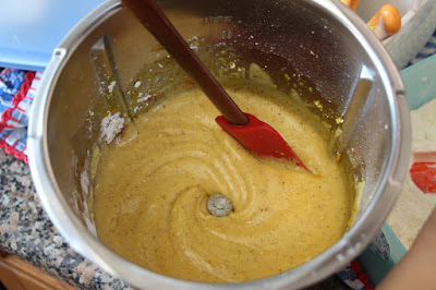No copo coloca-se a farinha, o açúcar, o fermento, a manteiga, as natas e a raspa de laranja, mistura-se tudo 5 seg/vel 6.